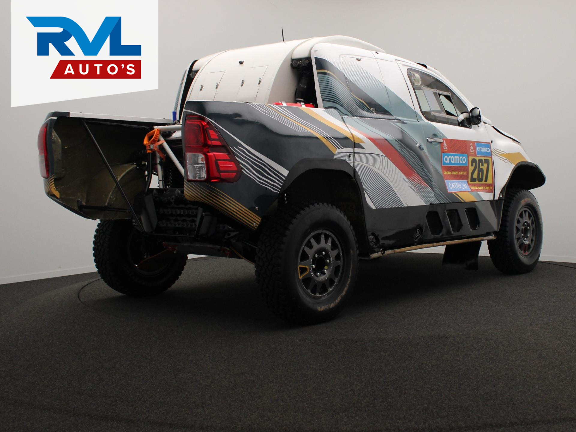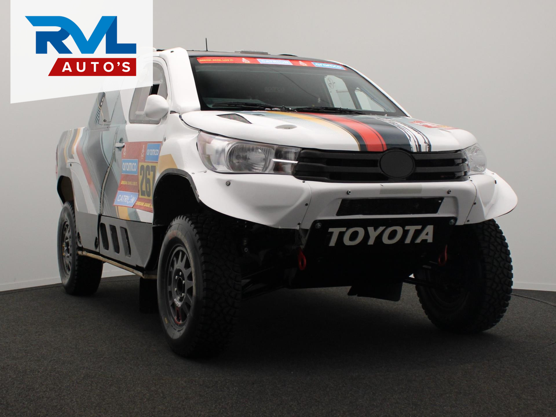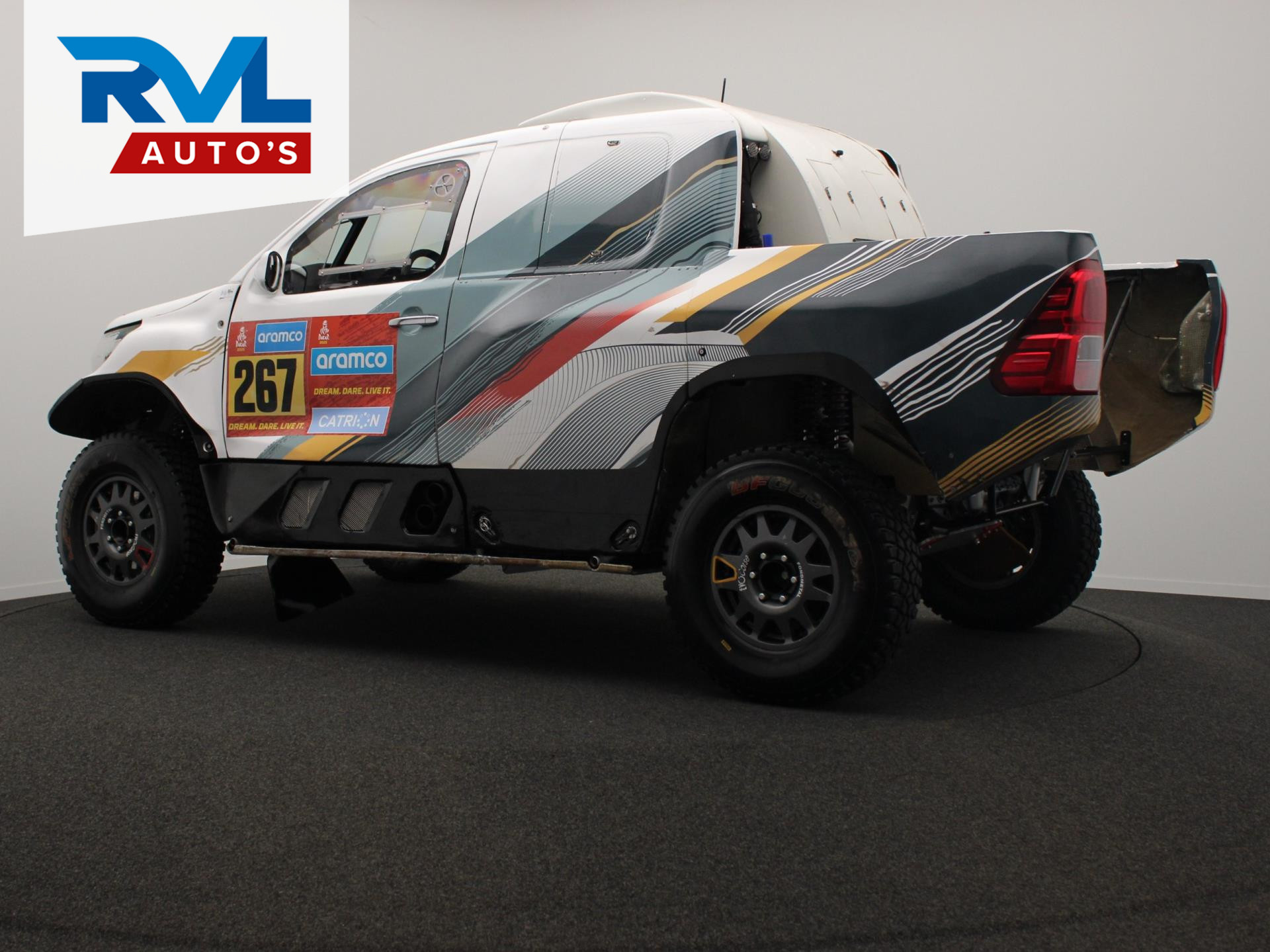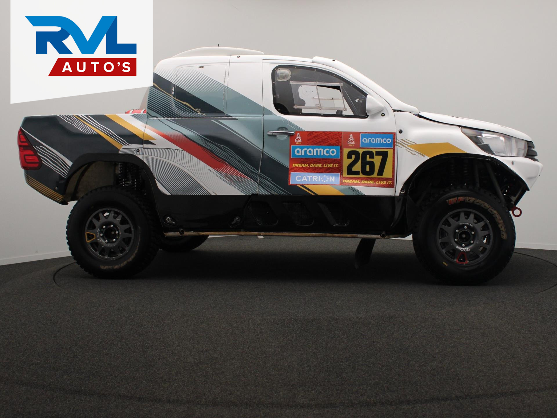 Te koop: originele Dakar fabrieks Toyota Hilux HIND 5.0 V8 uit 2019, gebouwd door Toyota Hallspeed in Zuid-Afrika. De auto is uitgerust met een geldig en actueel FIA-paspoort en is volledig up-to-date. Dit is een echte fabrieksauto zoals ingezet in de Dakar Rally, geen replica. Alles is professioneel onderhouden en klaar voor directe inzet in topniveau in de rally-raid wedstrijden.
